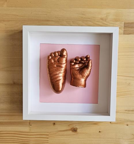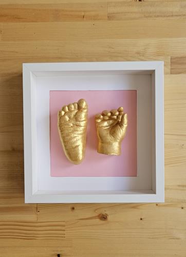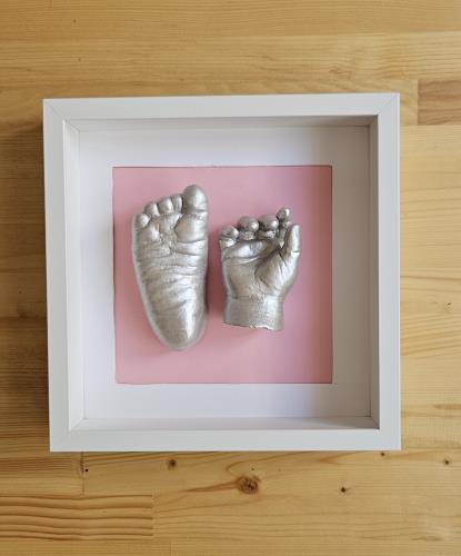 Kişiye özel 3 boyutlu bir el ve bir ayak heykel kiti (0-5 yaş), detaylı kullanım kılavuzu, hediye boya ve özel tasarım çerçeveli kutusu ile gönderilmektedir