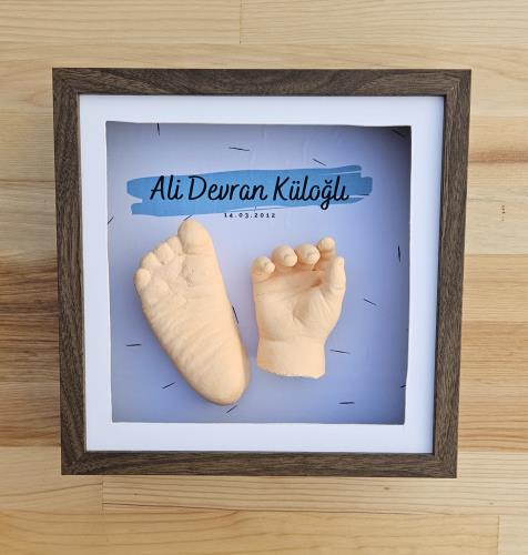 Kişiye Özel Mavi İsimli Ceviz Renk Çerçeve ile El ve Ayak Heykel Kiti